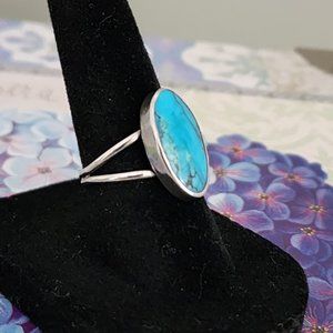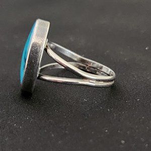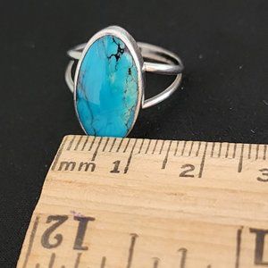 Vintage (circa 1990s) turquoise split shank ring. Size 8.5. Total weight = 2.55 grams. Elongated oval shaped cabochon. Bezel setting. Signed on back. Good pre-owned condition. Please see photos. Rhe photos are part of the description. Smoke free home.