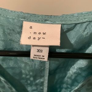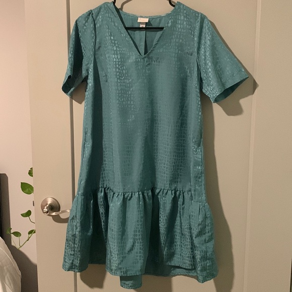 Short sleeved dress. The brand, A New Day, is from Target. Color is similar to turquoise with shiny/reflective pattern. Length may run short for someone who is taller than 5’5. Dress size is closer to a medium.