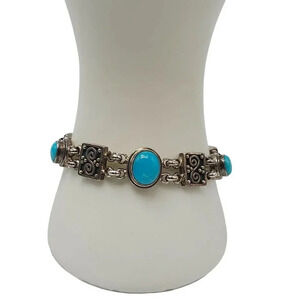 This exquisite vintage bracelet features beautiful turquoise stones set in sterling silver with an intricate design. It offers elegance and timeless charm.