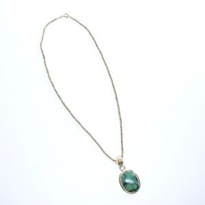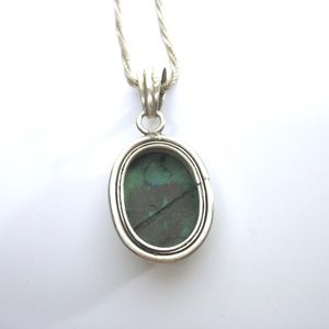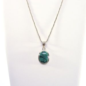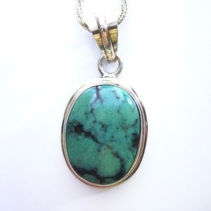 Vintage turquoise and sterling slide pendant on a rope chain, c.1980’s. The oval stone is a greenish blue turquoise with a black matrix. Including the bale, the pendant is 1 3/4” high x 7/8” wide. It's not signed but tested as sterling. The back of the stone has a shallow saw mark from the cutting and polishing process. 16 1/2” chain with a spring clasp marked 925 Italy. Large bale so easy to swap the chain for a longer or shorter one. Excellent vintage condition and a lovely gift idea.