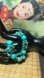 Gorgeous handmade design on this jewelry made of semi precious stone. This great-looking piece has a brilliant turquoise color. The large round beads look like howlite and have thin dark veins. They measure about 14mm. They are separated by sections of 3 strands of chips that are also a dyed turquoise with earthy grey brown spots. Item is in excellent used condition with sturdy elastic. There is a chipped chip where you can see white stone. Measures approximately 7”L.