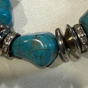 Capture effortless elegance with this captivating stretch bracelet. Showcasing a string of chunky turquoise-colored stones, each piece is uniquely veined with a natural, marbled effect, adding depth and character. The stones are interspersed with decorative silver tone metal accents, some encrusted with sparkling rhinestones, creating a harmonious blend of rustic and refined style. This bracelet is perfect for adding a pop of color and personality to casual everyday wear, completing a bohemian-inspired look, or accentuating a simple outfit with a touch of unique charm.