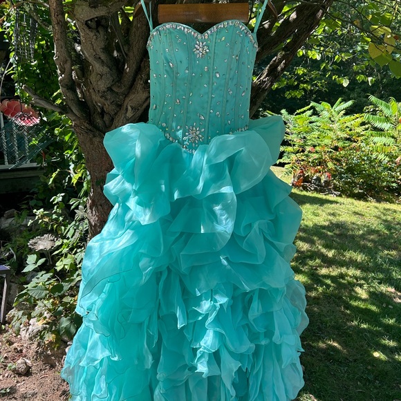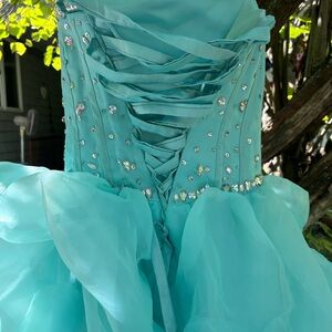 Elegant turquoise strapless gown with ruffled skirt and sparkling embellishments.