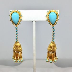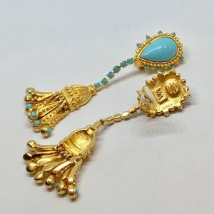 Designed by Nicholas Humphrey-Smith and produced under the license by V & A Jewelry. These turquoise tassel earrings consist of turquoise and gold-plated bell shaped tassels, which move individually with the wearer. These earrings are fashioned after the style of a West European design dating from 1835-1840. Inspired from an object in the Victoria and Albert Museum. The earrings are approximately 2 3/4 inches long, with clip earring backs. Pre-owned in excellent condition.