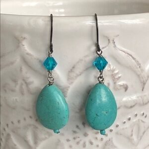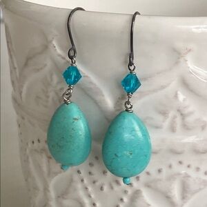 Turquoise Teardrop Shaped earrings with Swarovski Accents with hook drop