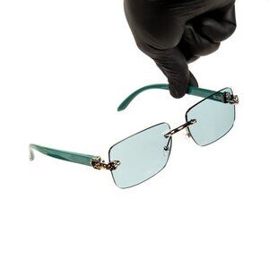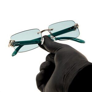 Turquoise Tint Rectangular Hip Hop Silver Frame Leopard Head Rimless Sunglasses