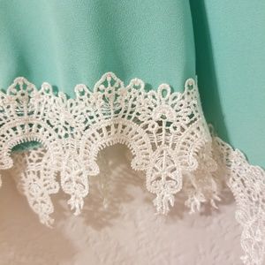 Turquoise Top with cute white lace embroidery, size Large but fits a Medium well. Only worn a few times, in excellent condition!