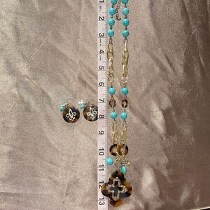 Elevate your style with this stunning turquoise and tortoiseshell necklace and earring set! The multi-strand necklace features beautiful turquoise-colored beads interspersed with gold-tone chain links and tortoiseshell accents, leading down to a chic tortoiseshell quatrefoil-shaped pendant with a prominent cross. Complementing the necklace are matching drop earrings, showcasing round tortoiseshell charms with intricate Fleur-de-Lis designs. This versatile set is perfect for adding a touch of bohemian elegance or a unique statement to any outfit, whether for a casual day out or a special evening.