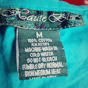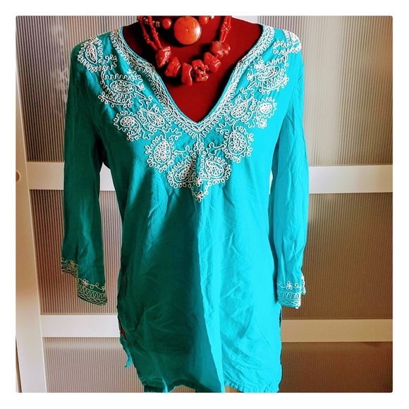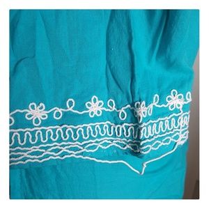 Cute Turquoise Tunic with White trim. Gentle wearhavent worn in a couple years. One sleeve white trim loose but easily fixed. No holes or tears, from smoke free home.