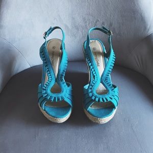 💘 Super unique and fun turquoise wedges purchased from Charming Charlie. Heel height about 4", comes with the original stuffing. Only worn once and barely any signs of wear! 💙