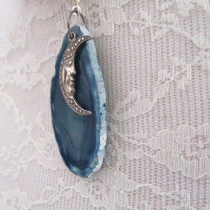 Turquoise agate slice choker necklace with silver 'man in the moon' charm. Beautiful turquoise dyed agate slice has a silver crescent moon charm. Agate piece is 2 1/4" long & silver tone choker is 16" & closes with a ball and loop.These are vintage pieces put on a new necklace. Agates are considered Power Stones. They are very grounding, solid and stable. All Agates have excellent protective and healing energy, and stimulate analytical capabilities and precision.