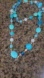 Stunning long necklace featuring an array of round and oval beads in various shades of blue and clear. Gold-tone chain accents. Perfect for adding a pop of color.