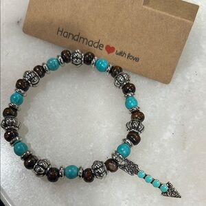 Handmade bracelet featuring turquoise and brown beads with a silver arrow charm.