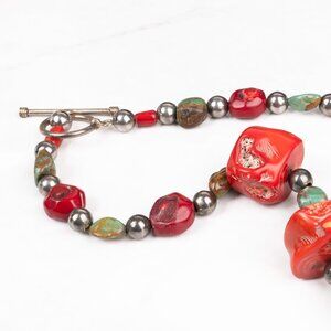 Turquoise and Chunky Red Coral & Silver Bead Statement Vintage Necklace