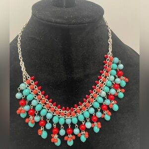 Turquoise and Coral Color Beaded Necklace and Earrings