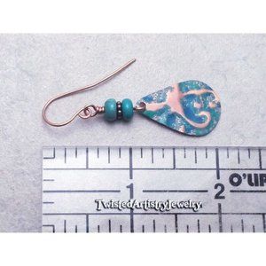Dangle is approximately 1 1/2" long (approx. 2" long from top of ear wire). Findings and metal embellishments are solid copper (ear wires have a tarnish resistant enamel coating).