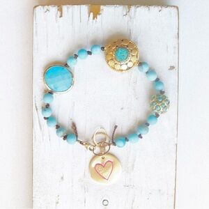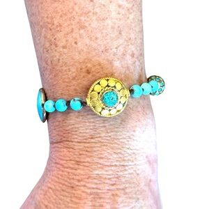 Beautiful handcrafted turquoise bracelet designed by Bare and Me. It is hand tied silk with beautiful sleeping beauty turquoise beads and vermeil and turquoise findings.