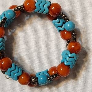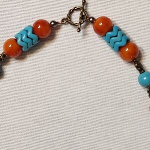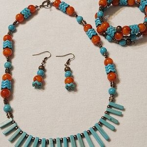 This vibrant jewelry set features a stunning combination of turquoise and orange beads. Perfect for adding a pop of color to any outfit.