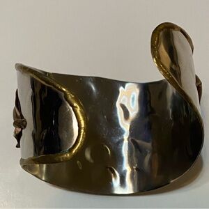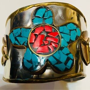 This stunning cuff bracelet features a vibrant turquoise and red floral design, perfect for adding a pop of color to any outfit. The intricate mosaic pattern is set against a gold-toned base, offering a unique and stylish accessory for any jewelry collection.