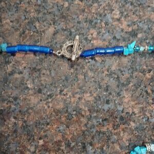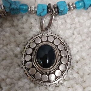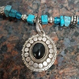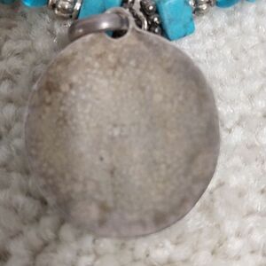 Elegant turquoise and silver beaded necklace with a unique 925 pendant. Perfect for adding a touch of color to any outfit. The large oval pendent is showy and noticable for sure. The dot design is found on very high end jewelry.
