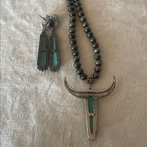 Elegant faux turquoise and silver jewelry set featuring a necklace and matching earrings. Perfect for adding a touch of color to any outfit.
