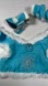 Stylish turquoise pet winter outfit with white faux fur trim. Features a snowflake design. Includes 4 matching shoes. New without tags.