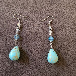 Beautiful pair of turquoise and crystal drop earrings. Dangling statement earrings Teal and crystal beaded bohemian style.