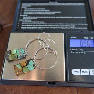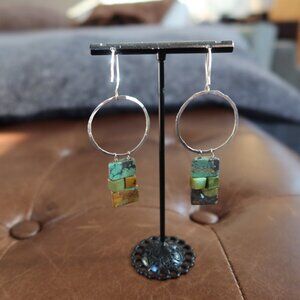 Each earring has a large ear hook connected to hammered sterling silver circle which then has one rectangle turquoise bead followed by 2 square turquoise beads, followed by another rectangle (8 beads total)