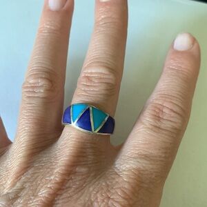 Turquoise and lapis inlay wavy band ring size 8 sterling silver 925