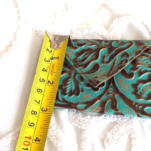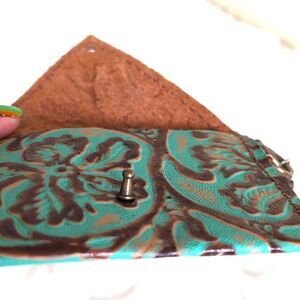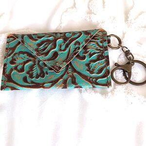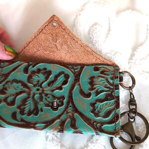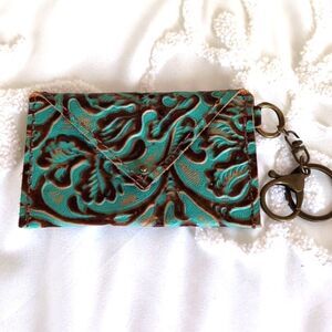 Turquoise and Brown Leather Tooled Artisan Keychain/C Card Money /Mini Wallet