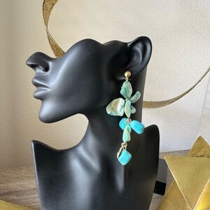 Elegant turquoise dangle earrings featuring gold shell accents. Perfect for adding a touch of color and style to any outfit.