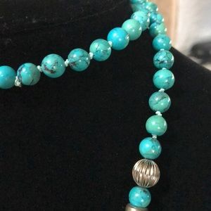 This is a beauty!!! It’s a long stand (19”) of beautiful real turquoise beads hand knotted after each bead. Sturdy weight to it. Can be doubled up or worn long !!!