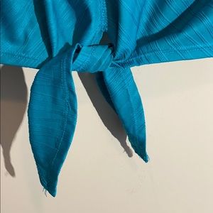 Hello! We have a turquoise blouse with a textured design and you can tie it at the bottom.