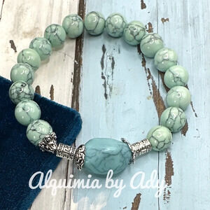 Turquoise blue crystal pearl silver statement beaded bracelet colorful handmade