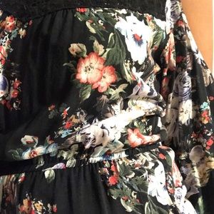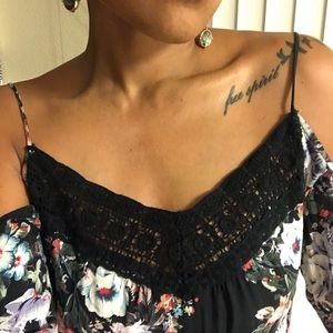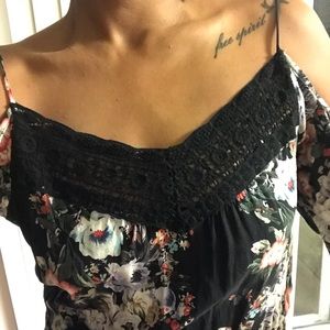 Soft cotton blend loose fitting sweater $15.00. Floral off the shoulder shorts romper $12.00.