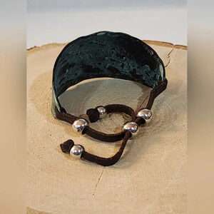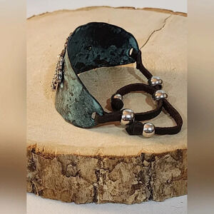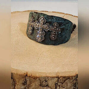 This bracelet features a rustic, distressed green patina finish, giving it a vintage, weathered look. Adorned with metallic cross embellishments, each decorated with small, intricate detailing and rhinestones, it offers a bold, statement-making appearance. The bracelet is wide and crafted to resemble aged leather or metal, enhancing its rugged, bohemian aesthetic. It fastens with an adjustable strap and clasp, allowing for a comfortable fit. This piece would add a distinctive edge to any outfit, ideal for those who favor unique, artisanal accessories.