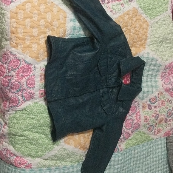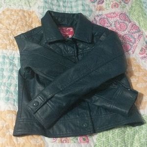 Turquoise leather jacket the floral designed inside with buttons and 2 front pockets