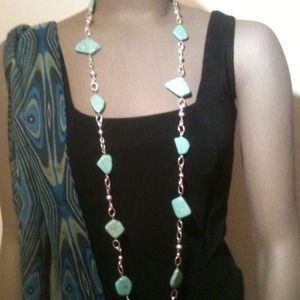Turquoise necklace with silver-tone components. 44 inches in length. Handcrafted. Beautiful with any outfit !