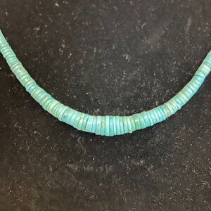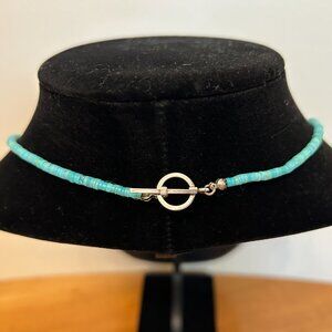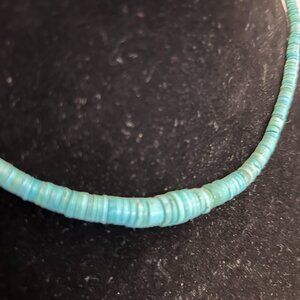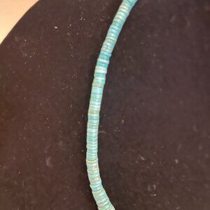 Real turquoise and silver, so you WILL have to clean the clasp with a silver cleaner on a regular basis.