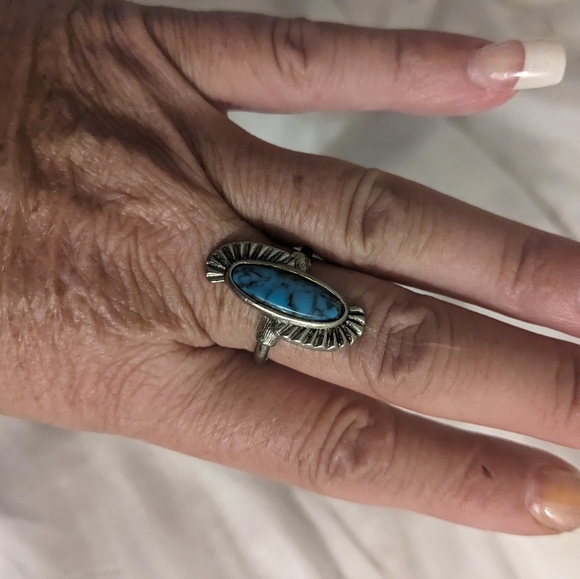 turquoise oval stone set in half shapes of silver surrounding the stone...set in sterling silver ring size 7