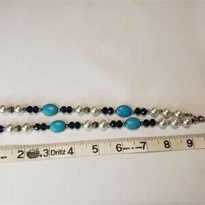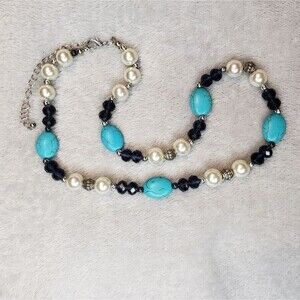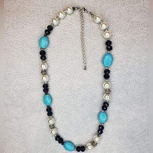 Turquoise, faux pearl, silver bead, blue bead, gem stone necklace