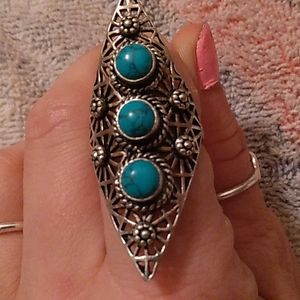 Gorgeous 3 stone turquoise and silver ring. It's about a size7/ 8 because I wear size 7 on middle finger and it's a tad loose on me but barely. Beautiful details all around it .Lovely statement ring!! reasonable offers are welcome !!