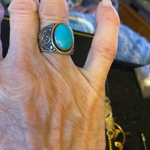 Turquoise ring Size 6 Band has Southwestern scroll workSS .925 Has maker mark