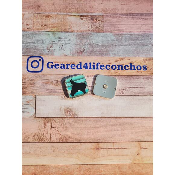 Serape turquoise and mule inlay 1 1/4" custom set of conchos Set of 2 Square screw back. We use a combination of Swarovski and percosia crystal and stones for bling to give a unique effect please pm for customization requests. Handcrafted western tack bling great way to snazzy up your bridle or other tack can also customize colors and styles. Plated screwback concho with sealed in clear poly resin. Easy to add to a belt, purse, wallet, backpack and really anything you can punch a hole in or can covert into a pendant or drawer pull use your imagination. Conchos can also can used as a focal pendant or made into a bridle rosette, earrings, necklaces, rings, bracelets, tack accessories, bling for your chaps, saddle blanket, flip flops, key chains, dog collars, halters and more Thanks for looking!