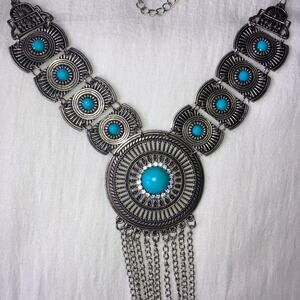 Turquoise silver pendant statement fringe necklace. Good condition pre owned.