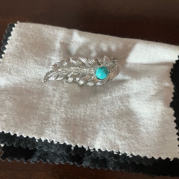 Turquoise stone, silver, feather ring with rhinestones. Fits all sizes