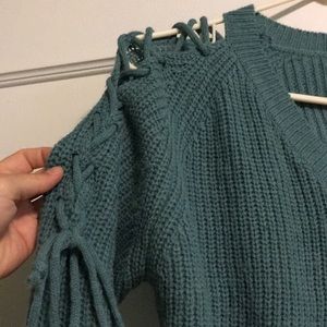 Listicle boutique sweater with adjustable laced up shoulders can be worn more “cold shoulder” or pulled tight. Great condition no pilling