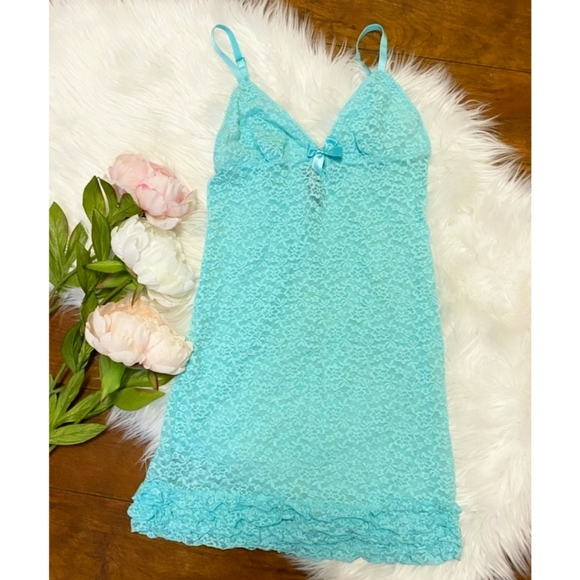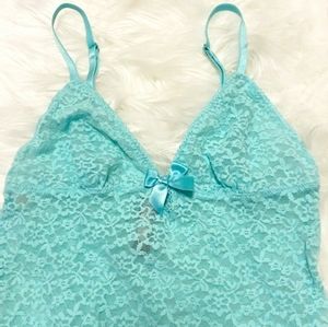 Cute little teal teddy from Victoria's Secret. Stretchy fabric. Has cute details such as a tiny bow in front and frills around the bottom. Has adjustable straps.