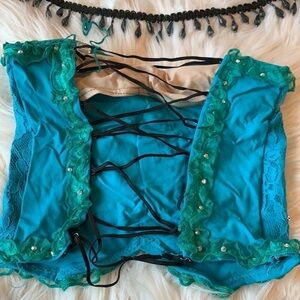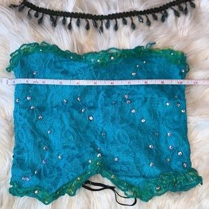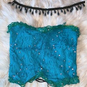 Turquoise two piece dance costume adorned with Swarovski Crystals