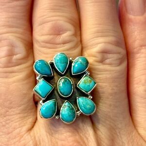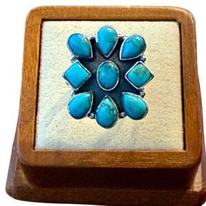 Turquoise Cluster Stone Floral Ring Southwestern Adjustable Sterling Silver